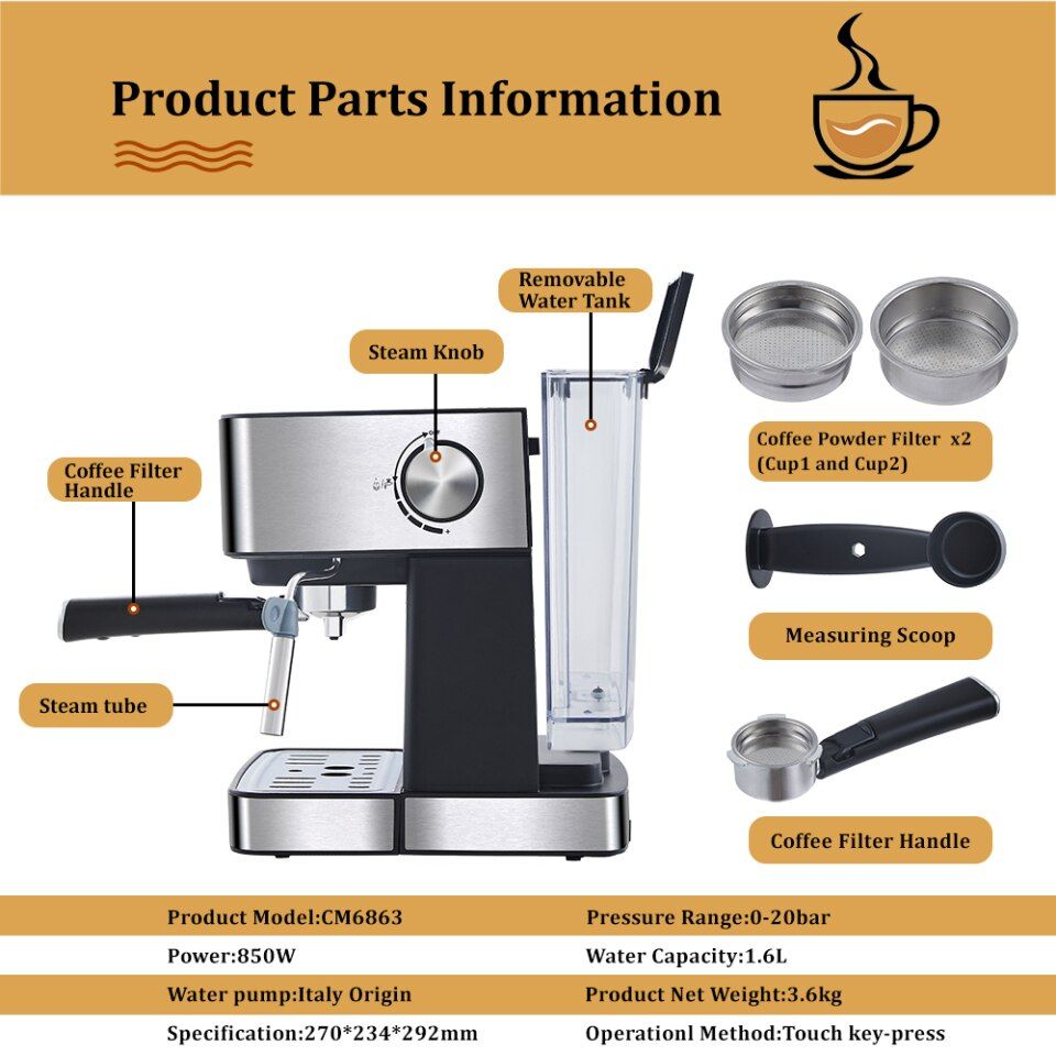 20-Bar Pressure Pump: Ensures consistent water flow through the coffee grounds for a rich, aromatic espresso