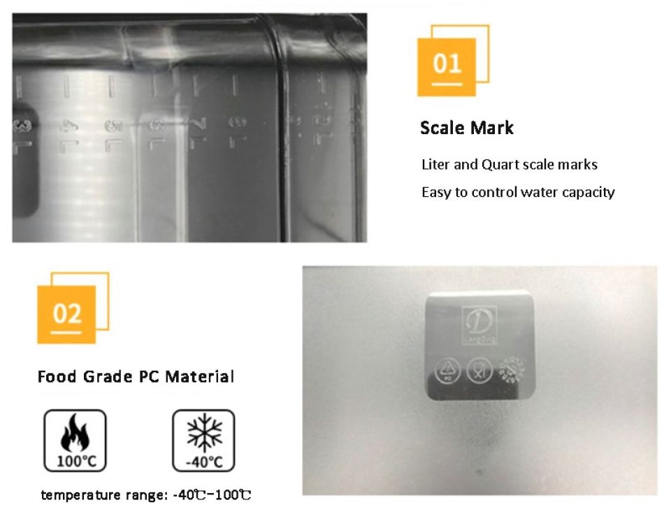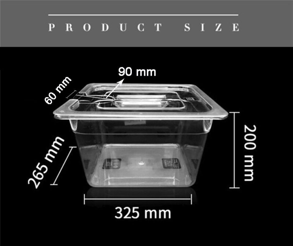 · ✔ IMMERSION CIRCULATOR COMPATIBLE… with sturdy sides ready for mounting most sous vide cookers in the market · ✔ RETAIN HEAT & WATER VAPOR…Notched cover allows removal without moving circulator, minimum Water Evaporation, Cook long time even over night without having to refill water. · ✔ COOK LARGE MEALS QUICKLY… with a generous Sous Vide Container 11L capacity that easily fits whole chickens or roast cuts. Prep gourmet meals for the whole gang in one go. · ✔ FAST & STRESS-FREE CLEANING… Totally dishwasher safe. No more messy scrubbing or struggling with large containers in the sink. Throw it in the machine! · ✔ DROP DURABILITY… unlike glass, it’s shatter-resistant so you won’t be sweeping shards off your kitchen when you should be cooking a great meal. · ✔ HEATPROOF GUARANTEE… with polycarbonate material that withstands up to 100°C/210°F. Heat up as high as you need to slow-cook tender meats perfectly all the way through. Container size: 325*265*200mm Weight: 1.8KG Material: Thicken Food Grade PC Material Application Temperature Range: -40℃ to 100℃